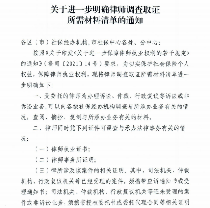 青岛市社会保险事业中心印发《关于进一步明确律师调查取证所需材料清单的通知》